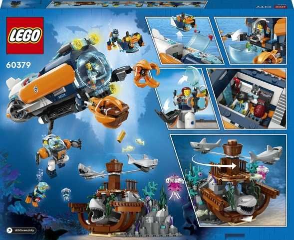 • Herní stavebnice průzkumu oceánu – Stavebnice LEGO® City Hlubinná průzkumná ponorka (60379) je plná vybavení a funkcí pro úžasná průzkumná dobrodružství pod hladinou • Co vás čeká v krabici? – Vše, co děti potřebují k sestavení hlubinné ponorky, dron, potápěčský oblek, vrak lodi, 6 minifigurek průzkumníků a figurka kostlivce, 3 žraloků, 2 medúz a 4 ryb • Parádní funkce pro rozmanitější hraní – Kolem vraku lodi krouží 2 žraloci s funkcí žraločího překvapení • Stavebnice pro fanoušky kreativní zábavy – Zábavný dárek pro děti od 7 let k narozeninám, Vánocům nebo jakékoli jiné příležitosti • Rozměry – Průzkumná ponorka měří přes 11 cm na výšku, 31 cm na délku a 17 cm na šířku • Doplňky minifigurek – Mezi doplňky LEGO® v této sadě najdete fotoaparát, skener, hasák, injekci, nůžky, páčidlo, meč, drahokam a 2 louče • Nechybí interaktivní návod – Objevte aplikaci LEGO® Builder. Umožní dětem prozkoumávat a ukládat si virtuální stavebnice, sledovat postup stavění a přibližovat, otáčet a prohlížet modely ve 3D, zatímco na nich pracují • Nekonečné akční možnosti – Spojte tuto stavebnici s ostatními modely z řady LEGO® City a zažijte ještě více zábavných dobrodružství • Hračky, na které se můžete spolehnout – Již od roku 1958 splňují všechny kostky LEGO® nekompromisní oborové standardy, díky čemuž jsou dílky konzistentní, kompatibilní a zaručují zábavné hraní • Maximálně přísné testy – Kostky a dílky LEGO® pouštíme na zem, zahříváme, drtíme, kroutíme a analyzujeme, abychom zajistili, že splňují striktní globální bezpečnostní standardy