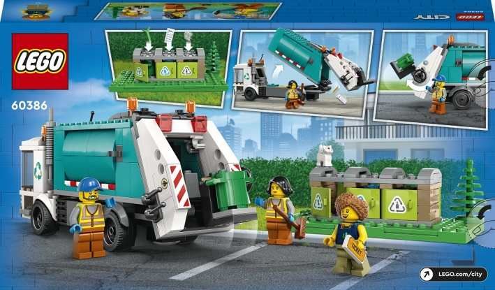 • Popelářský vůz – S modelem Popelářský vůz (60386) od LEGO® City bude péče o životní prostředí zábava. Nechybí ani recyklační středisko • Co najdete v krabici? – Vše, co děti potřebují k sestavení modelu Popelářský vůz od LEGO® City, a k tomu navíc recyklační středisko se 3 kontejnery, 3 minifigurky a figurku kočky • Zábavné funkce pro děti, které zbožňují kreativní hraní – Děti mohou vyprázdnit kontejnery na tříděný odpad do vozu tím, že aktivují vyklápěcí plošinu. Celý obsah pak mohou vyklopit zvednutím ploché korby vozidla • Dárek LEGO® pro každou příležitost – Udělejte tímto modelem radost dětem od 5 let k narozeninám nebo prostě jen tak • Rozměry – Po sestavení měří popelářský vůz přes 8 cm na výšku, 21 cm na délku a 6 cm na šířku • Baterie nejsou zapotřebí – Model si vystačí s dětskou představivostí • Tištěný a digitální návod na stavění – Díky aplikaci LEGO® Builder s návody na stavění pro chytré telefony a tablety si děti mohou model přibližovat, otáčet a prohlížet ze všech úhlů • Děti se učí hrou – Řada LEGO® City děti podporuje v rozvoji dovedností zábavnými modely a postavami, které inspirují k otevřenému, tvořivému hraní • Stavebnice s garantovanou kvalitou – Všechny kostky LEGO® splňují nekompromisní oborové standardy, díky čemuž jsou dílky konzistentní, kompatibilní a zaručují zábavné hraní • Bezpečnost na prvním místě – Kostky a dílky LEGO® pouštíme na zem, zahříváme, drtíme, kroutíme a analyzujeme, abychom zajistili, že splňují přísné globální bezpečnostní standardy