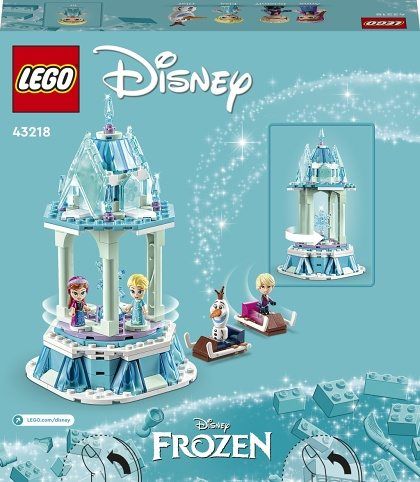 • Nekonečná zábava – Darujte sadu LEGO® | Disney (43218) Kouzelný kolotoč Anny a Elsy fanouškům filmu Ledové království ze studia Disney nebo jakémukoli malému staviteli od 6 let, který miluje kolotoče, a inspirujte je ke kouzelnému hraní • Na hraní i na výstavku – V této stavebnici najdete kolotoč inspirovaný ledovým zámkem z filmu Ledové království od Disney. Je v něm místo pro 4 postavy a lze s ním točit a nechybí ani 2 miniaturní sáňky pro další porci zábavy • Známé postavy – Tato sada je stvořena pro neomezenou dávku herní akce a obsahuje 4 postavy z filmu Ledové království od Disney: mikropanenku LEGO® Annu, Elsu, Kristoffa a figurku LEGO Olafa • Skvělá odměna – Darujte tuto sadu dětem od 6 let, které milují film Ledové království od Disney, kolotoče nebo nápadité hraní. Poslouží jako zábavný dárek k narozeninám, Vánocům nebo jakékoli jiné příležitosti • Kompaktní model plný zábavy – Kolotoč měří přes 17 cm na výšku a 9 cm na šířku a inspirujte děti k dlouhým hodinám kreativního hraní a před dalším hraním se bude nádherně vyjímat na výstavce • Nový způsob stavění – Proveďte děti na jejich příštím stavitelském dobrodružství s pomocí intuitivní aplikace s návodem LEGO® Builder. Umožní jim ukládat si stavebnice, sledovat postup a přibližovat a otáčet modely ve 3D, zatímco na nich pracují • Dovednosti důležité pro život – Díky 3 mikropanenkám LEGO®, figurce LEGO a detailnímu modelu kolotoče tato zábavná stavebnice na motivy pohádky od Disney inspiruje ke kreativnímu hraní a přispívá k rozvoji důležitých dovedností • Kvalita bez kompromisů – Už od roku 1958 splňují dílky LEGO® přísné standardy a umožňují konzistentní spojování • Bezpečnost na prvním místě – Dílky LEGO® pouštíme na zem, zahříváme, drtíme, kroutíme a analyzujeme, abychom zajistili, že vyhovují přísným globálním bezpečnostním standardům