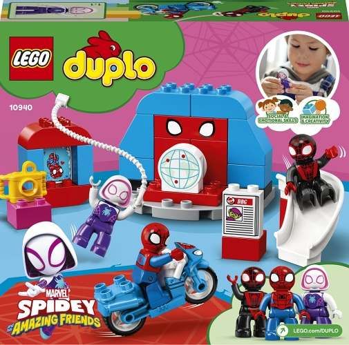 "Stavebnice LEGO® DUPLO® Marvel Základna Spider-Mana (10940) skvěle poslouží jako ideální dáreček pro všechny malé superhrdiny. Děti si užijí dlouhé hodiny hraní se 3 minifigurkami superhrdinů a čeká je bezpočet zábavných herních možností. Legrace a akce se Spider-Manem a přáteli > Tato stavebnice na motivy seriálu Spidey and His Amazing Friends od Disney+ je dělaná na míru těm nejmenším stavitelům. Užijí si s ní jak dobrodružství a legraci s oblíbenými hrdiny, tak rozvoj dovedností, který přináší hraní se stavebnicemi LEGO DUPLO. V sadě na děti čekají 3 superhrdinové – Spider-Man, Miles Morales a Ghost Spider. Nechybí model základny ve tvaru pavouka plný zábavných doplňků, které inspirují ke kreativnímu hraní příběhů, včetně motorky, klouzačky a houpačky. Kreativní a nápadité hraní rolí pro ty nejmenší > Hračky LEGO DUPLO otevírají předškolákům svět neomezeného hraní, sebevyjadřování a zábavného učení, a umožňují tak rodičům a dětem společně prožívat vzácné vývojové milníky." „• Stavebnice LEGO® DUPLO® se Spider-Manem, která dětem pomůže s rozvojem klíčových dovedností. • Nechybí figurky Spider-Mana, Milese Moralese a Ghost Spider. • Děti pomohou 3 superhrdinům pracovat jako tým na vzrušujících misích. • Udělejte radost předškolákovi, který miluje superhrdiny, touto stavebnicí pro děti od 2 let. • Model měří přes 19 cm na výšku, 12 cm na šířku a 13 cm do hloubky. • Rodiče s dětmi modely hravě postaví díky jednoduchému tištěnému návodu. • Sady LEGO® DUPLO® jsou navržené tak, aby inspirovaly k nápaditému hraní podporujícímu vývoj. • Sady LEGO® DUPLO® splňují nejvyšší oborové standardy kvality. • Kostky a dílky LEGO® DUPLO® splňují přísné normy týkající se bezpečnosti dětí.“
