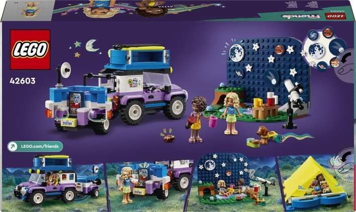 • Stavebnice Karavan na pozorování hvězd – Součástí je vozidlo 4×4 s karavanem a stanem, 2 minipanenky, pes, ježek a spousta doplňků pro děti od 7 let• Vytvářejte souhvězdí – Malí milovníci vědeckého bádání si užijí spoustu zábavy při vytváření vlastních souhvězdí z planet a hvězd na pozadí• 2 minipanenky a 2 figurky zvířat – Součástí stavebnice jsou postavy LEGO® Friends Nova a Aliya a figurka psa a ježka, takže dobrodružství může hned začít• Doplňky k dobrodružnému táboření – V krabici najdete teleskop, hrníčky, sušenky, dalekohled, baterku, hvězdy navíc a obrázky dalších planet, se kterými si přizpůsobíte souhvězdí• Skvělý nápad na dárek – Stavebnice představuje zábavný dárek k narozeninám, Vánocům nebo jakékoli jiné příležitosti pro děti, které milují vesmír• Kreativní stavebnice – Nenechte si ujít další sady z řady LEGO® Friends (prodávají se samostatně), ve kterých malí stavitelé objeví spoustu rozmanitých postav a vydají se s nimi na dobrodružství jako ze skutečného života• Rozměry – Stavebnice se skládá z 364 dílků a karavan s pohonem 4×4 měří přes 9 cm na výšku, 11 cm na délku a 6 cm na šířku