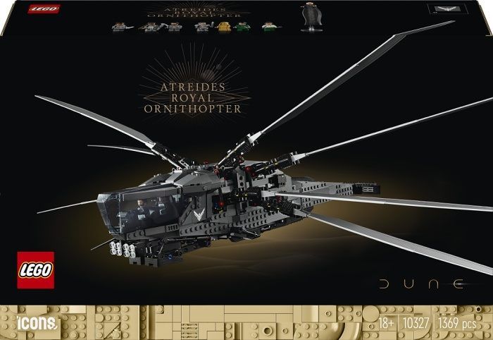 • Stavebnice ze světa Duny pro dospělé – Sběratelská stavebnice LEGO® Icons Duna: Atreides Royal Ornithopher pro fanoušky filmu Duna z roku 2021 • Co najdete v krabici – Vše, co potřebujete k sestavení repliky ornitoptéry Atreides Royal Ornithopher s vyklápěcími mávajícími křídly a zatahovacím podvozkem z kostek LEGO® a 8 minifigurek filmových postav • Řada minifigurek – Nechybí Paul Atreides, lady Jessica, Gurney Halleck, Chani, Leto Atreides, Liet Kynes, Duncan Idaho a baron Harkonnen v dlouhé róbě • Filmový kousek na výstavku – Tuto sběratelskou repliku z kostek LEGO® si můžete vystavit v režimu letu nebo přistávání. Součástí je také 8 minifigurek, se kterými vytvoříte velkolepé filmové scény • Tip na dárek s filmovou tematikou – Darujte stavebnici LEGO® Icons Duna Atreides Royal Ornithopher fanouškům Duny a nadšencům do kinematografie • Obsahuje digitální návod na stavění – Aplikace LEGO® Builder přináší digitální verzi návodu na stavění, který je součástí této stavebnice LEGO Icons • Relaxační projekty LEGO® pro dospělé – Tato stavebnice LEGO Icons je součástí řady pokročilých modelů navržených pro dospělé • Rozměry – Model se skládá z 1 369 dílků a s rozloženými křídly měří přes 23 cm na výšku, 57 cm na délku a 79 cm na šířku