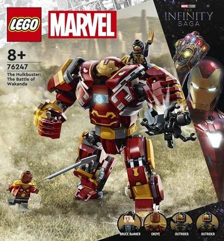 • Obří marvelovský robot – Otevřete dětem bránu do akčního světa marvelovského filmu Avengers: Infinity War pohyblivým modelem Hulkbuster: Bitva o Wakandu (76247) od LEGO® Marvel • Kultovní akční hrdinové – Součástí je sestavitelný Hulkbuster a 4 minifigurky: Bruce Banner s otáčecí hlavou, která má na druhé straně „zelený“ obličej, dále Okoye s kopím a 2 outrideři • Pohyb díky kloubním spojením – Děti mohou robota během hraní rozpohybovat a různě polohovat. Uzamčené kolenní klouby poskytují stabilitu a v otevíracím kokpitu je prostor na minifigurku pilota • Dárek pro děti – Darujte tento sestavitelný model Hulkbustera k narozeninám, Vánocům nebo prostě jen tak fanouškům akčních superhrdinů a marvelovských filmů od 8 let • Hraní na cesty – Přenosný robot měří přes 15 cm na výšku, takže si jej děti mohou vzít kamkoli s sebou • Interaktivní digitální stavění – Aplikace LEGO® Builder s návody na stavění potěší intuitivními nástroji přibližování a otáčení, které dětem umožní vizualizovat si model, zatímco na něm pracují • Ještě více zábavy – Rozsáhlá řada sběratelských stavebnic LEGO® Marvel, které lze vzájemně kombinovat, inspiruje malé stavitele inovativními prvky a neomezenými možnostmi stavění a hraní • Záruka kvality – Dílky LEGO® splňují striktní oborové standardy kvality, což znamená, že jsou konzistentní a kompatibilní a umožňují hladké spojování • Záruka bezpečnosti – Dílky LEGO® pouštíme na zem, zahříváme, drtíme, kroutíme a analyzujeme, abychom zajistili, že splňují náročné globální bezpečnostní standardy