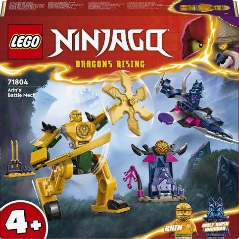 • Nindžovská hračka pro začínající stavitele – Děti od 4 let s akční stavebnicí Arinův bojový robot objeví radost ze stavění a vychutnají si příběhy s nindži• Pohyblivý robotický oblek – Děti si s touto stavebnicí robota s kokpitem, pohyblivými končetinami, otáčející se čepelí a velkým mečem připomenou bitvy z 2. řady televizního seriálu NINJAGO® Dračí povstání• 2 minifigurky LEGO® NINJAGO® – Součástí nindžovské stavebnice je minifigurka Arina s katanou a válečníka s vlčí maskou a mečem, se kterými si děti užijí nekonečné souboje• Letec a křišťálová jeskyně – Součástí stavebnice je letec s pohyblivými křídly, vystřelovačem disků a 2 oštěpy, křišťálová jeskyně s palicí roztříštění a stojanem na zbraně se 2 katanami• Nindžovský dárek – Tato zábavná kreativní stavebnice LEGO® poslouží jako krásný dárek pro děti od 4 let a představuje skvělý způsob, jak v malých stavitelích rozvíjet představivost a schopnost vyprávění příběhů• Objevte další stavebnice pro děti – Nenechte si jít další stavebnice NINJAGO® (prodávají se samostatně) s draky, roboty a legendárními nindži• Úvod do světa kostek LEGO® – Stavebnice LEGO z edice 4+ pomohou dětem seznámit se stavěním z kostek – a samozřejmě se může přidat i zbytek rodiny?• Rozměry – Tato stavebnice LEGO® se skládá ze 104 dílků a součástí je robotický oblek, který měří přes 10 cm na výšku