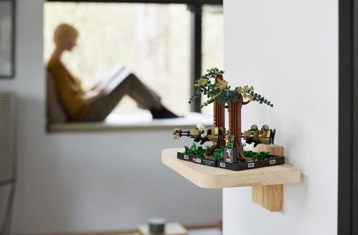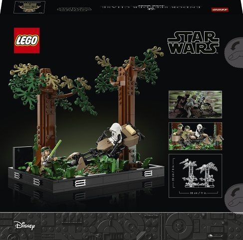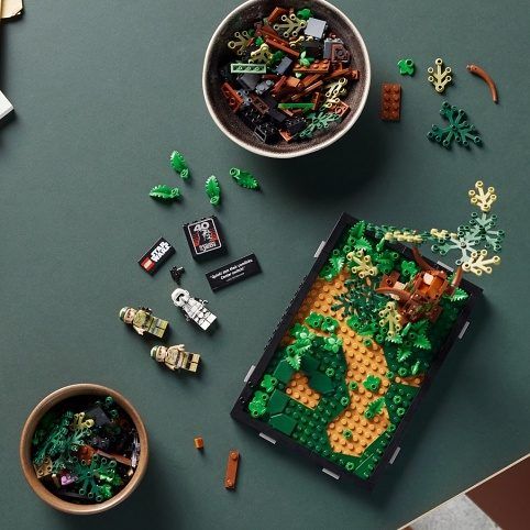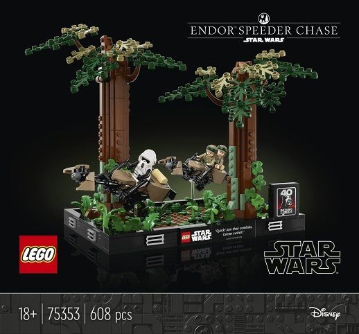 Postavte dynamickou scénu, ve které princezna Leia a Luke Skywalker pronásledují průzkumného vojáka v lesích na měsíci Endoru. Vytvořte les ze sestavitelných stromů a nových prvků kapradin, které jsou novinkou pro květen 2023. Napózujte spídrové motorky mezi stromy v takových úhlech, aby z nich přímo sršela rychlost. Nostalgický kousek doplňte plaketkou ke 40. výročí filmu Star Wars: Návrat Jediho.