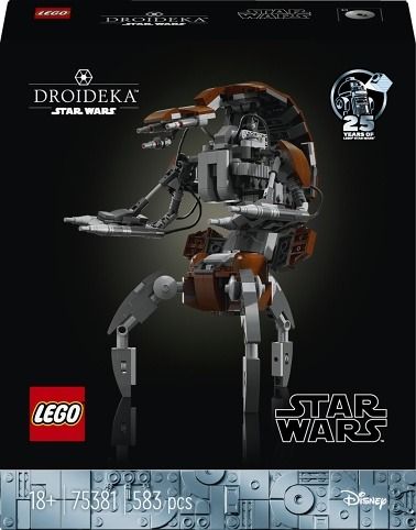 • Sestavitelná figurka LEGO® droida Droideky – Vytvořte zábavný výstavní kousek s tímto sběratelským modelem ničivého droida Droideky z filmu Star Wars: Skrytá hrozba a Star Wars: Klonové války• Fantastická dobrodružná stavebnice LEGO® Star Wars™ s hravými detaily – Pohybujte rukama Droideky dopředu a dozadu jako při střelbě a připevněte k droidovi nohy, aby se přeměnil do kulaté podoby• Figurka LEGO® droida Droideky – Součástí hlavního sestavitelného modelu ničivého droida z této stavebnice je také malá figurka LEGO droida Droideky• Oslava 25. výročí – V této jedinečné stavebnici najdete malou figurku LEGO® droida Droideky, informační cedulku o Droidekovi a kostku k 25. výročí LEGO Star Wars™• Dárek LEGO® Star Wars™ pro dospělé – Udělejte si radost nebo darujte tuto prémiovou stavebnici jinému dospělému fanouškovi Star Wars nebo nadšenému sběrateli stavebnic LEGO Star Wars• 3D návod na stavění – Aplikace LEGO® Builder vám umožňuje během stavění přibližovat a otáčet digitální verzi modelu ve 3D, sledovat postup, ukládat stavebnice a spoustu dalšího• Stavebnice LEGO® Star Wars™ pro dospělé – Tyto stavebnice z předaleké galaxie LEGO Star Wars jsou určeny nadšencům jako vy, kteří rádi soustředěně relaxují u zábavných, kreativních činností• Stavění, vystavování i hraní – Figurka LEGO® droida Droideky se skládá z 583 dílků a měří přes 21 cm na výšku