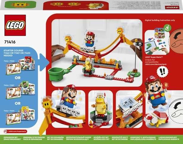 • Svezte se na lávové vlně (71416) – Děti mohou tímto rozšiřujícím setem obohatit svůj svět LEGO® Super Mario™ o zábavnou lávovou úroveň. Těšit se lze na „přelévající se“ lávovou vlnu a postavy protivníků ze hry Super Mario™ • 3 figurky LEGO® Super Mario™ – Součástí stavebnice je Ohnivý Bro a 2 Lávové bubliny • „Přelévající se“ lávová vlna – Pomozte LEGO® Mariovi, LEGO® Luigimu nebo LEGO® Peach™ (figurky nejsou součástí balení) svézt se lávovým výtahem a sbírat digitální mince za to, že se na vlně udrží a porazí Lávové bubliny • Skupinové hraní – Pokud jsou na hraní dva, může jeden hráč jezdit na lávové vlně s interaktivní figurkou LEGO® Super Maria (není součástí), zatímco druhý hráč porazí Ohnivého Bro • Skvělý dárek pro hráče od 7 let –Tento set s 218 dílky poslouží jako zábavný dárek pro děti, které vlastní některý ze startovacích setů LEGO® Super Mario™ (71360, 71387 nebo 71403), jenž je k interaktivnímu hraní potřeba • Přestavujte a kombinujte – V základním provedení měří modulární model přes 18 cm na výšku, 32 cm na šířku a 15 cm do hloubky a je navržen tak, aby jej bylo možné kombinovat s dalšími sety LEGO® Super Mario™ • Doprovodná apka – Stáhněte si aplikaci LEGO® Super Mario™, která obsahuje návody na stavění, inspirativní tipy a spoustu dalšího. Seznam kompatibilních zařízení s operačním systémem Android a iOS najdete na stránce LEGO.com/devicecheck • Inspirace pro dětskou představivost – Sběratelské sety LEGO® Super Mario™ umožňují samostatné i skupinové hraní, přinášejí zábavu při sbírání mincí a neomezené kreativní možnosti v podobě rozšiřování a přestavování • Vysoká kvalita – Dílky LEGO® splňují přísné oborové standardy kvality, takže umožňují jednoduché a bezpečné spojování do robustních modelů • Záruka bezpečnosti – Kostky LEGO® pouštíme na zem, drtíme, kroutíme, zahříváme a analyzujeme, abychom zajistili, že splňují přísné globální bezpečnostní normy