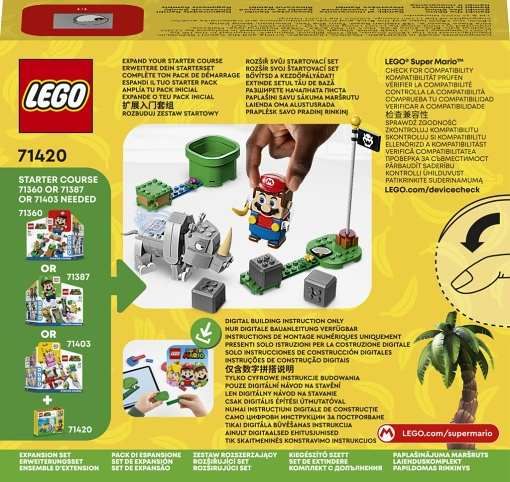 • Zábavné dupání a boření kamenů – Rozšiřte svou sbírku o set LEGO® Super Mario™ (71420) Nosorožec Rambi s figurkou Rambiho z kostek a s prvky kamenů • Projeďte se na Rambim – Posaďte LEGO® Maria, LEGO® Luigiho nebo LEGO® Peach™ (figurky nejsou součástí balení) na Rambiho, poté ho nechte chodit nebo narážet do objektů, což aktivuje digitální reakce interaktivní figurky • Vrstvitelné kameny – Rozběhněte se s Rambim do hroudy kamenů, zbořte je a objevte skrytý prvek banánu • Skvělý dárek pro hráče od 7 let – Darujte tento set se 106 dílky jako zábavný vánoční či jakýkoli jiný dárek dětem, které vlastní některý ze startovacích setů LEGO® Super Mario™ (71360, 71387 nebo 71403), jenž je k interaktivnímu hraní potřeba • Postavička z kostek – Rambi měří přes 6 cm na výšku, 11 cm na délku a 5 cm na šířku a lze ho přidat do dalších setů LEGO® Super Mario™ • Stavění s pomocí aplikace – Stáhněte si aplikaci LEGO® Super Mario™, která obsahuje návody na stavění, kreativní inspirace a spoustu dalšího. Seznam kompatibilních zařízení s operačním systémem Android a iOS najdete na stránce LEGO.com/devicecheck • Inspirace pro dětskou fantazii – Sety LEGO® Super Mario™ umožňují samostatné i týmové hraní, přináší hodiny zábavy při sbírání mincí a kreativní možnosti v podobě rozšiřování a přestavování • Prémiová kvalita – Už od roku 1958 splňují dílky LEGO® striktní oborové standardy kvality, díky čemuž umožňují konzistentní a pevné spojování • Bezpečnost je naší prioritou – Kostky LEGO® pouštíme na zem, drtíme, kroutíme, zahříváme a analyzujeme, abychom zajistili, že splňují přísné globální bezpečnostní standardy