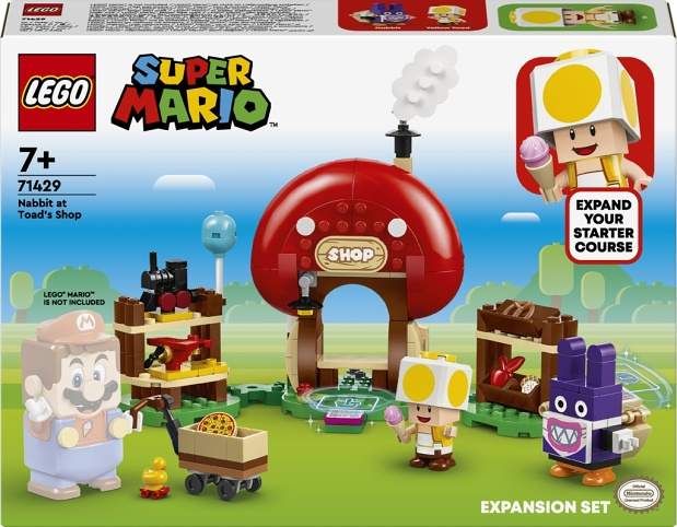 • Stavebnice se žlutým Toadem a figurkou Nabbita – Vydejte se s rozšiřujícím setem LEGO® Super Mario™ do Toadova obchůdku z kostek, kde najdete spoustu zábavných doplňků• 2 postavy ze světa Super Mario™ z kostek – Žlutý Toad a Nabbit mohou ve svých tlapkách držet doplňky a Nabbit se pyšní sestavitelným batohem• Sběratelská hračka pro děti s hravými detaily z kostek – V obchůdku najdete sestavitelný dávkovač zmrzliny, pec, stánky se spoustou hraček, doplňky v podobě jídla a nákupní vozík• Interaktivní virtuální hraní – Skočte s figurkou LEGO® Maria, LEGO® Luigiho nebo LEGO® Peach™ (figurky nejsou součástí balení) na akční prvek a dupněte na Nabbitův batoh, abyste získali řadu digitálních předmětů• Skvělý dárek pro hráče od 7 let – Tento set s 230 dílky poslouží jako zábavný dárek pro malé stavitele, kteří vlastní některý ze startovacích setů LEGO® Super Mario™ (71360, 71387 nebo 71403), jenž je k interaktivnímu hraní potřeba• Pomocná ruka – Stáhněte si aplikaci LEGO® Super Mario™, která obsahuje návody na stavění, inspirativní tipy a spoustu dalšího. Seznam kompatibilních zařízení s operačním systémem Android a iOS najdete na stránce LEGO.com/devicecheck• Inspirace pro dětskou fantazii – Sety LEGO® Super Mario™ umožňují samostatné i týmové hraní, přináší hodiny zábavy při hraní rolí, sbírání digitálních mincí a kreativní možnosti v podobě rozšiřování a přestavování• Model krámku – Toadův obchůdek měří přes 16 cm na výšku, 23 cm na šířku a 12 cm do hloubky a lze ho přidat do dalších setů LEGO® Super Mario™