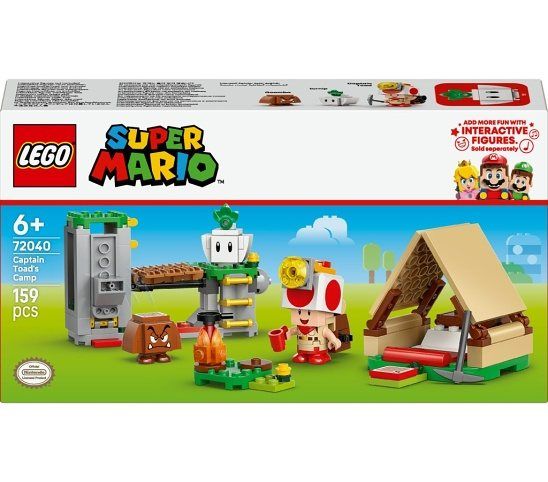 Zábavný set LEGO® Super Mario™ pro děti – Užijte si se stavebnicí Captain Toad a jeho tábor spoustu zábavy a postavte z kostek stan a táborák, hledejte poklad, zničte most, porazte nepřátele a další 3 figurky LEGO® Super Mario™ pro zábavné hraní – Tato stavebnice Nintendo® LEGO obsahuje Captain Toada, turnip a figurku Goomby, sestavitelný batoh a doplněk v podobě krumpáče, pánve a diamantů Hravé funkce – Pomozte Captain Toadovi zničit most a shoďte nepřítele do lávové řeky, najděte „diamanty“, uložte je do truhly s pokladem a pak odpočiňte si ve stanu Interaktivní digitální hraní – Skočte s figurkou LEGO® Mario™, LEGO® Luigi™ nebo LEGO® Peach™ (figurky nejsou součástí balení) na akční prvek na sestavitelné houpačce a užijte si výzvu v balancování Narozeninový dáreček pro děti – Darujte tuto stavebnici klukům, holkám a fanouškům od 6 let. Pro interaktivní hraní je potřeba jedna ze stavebnic 71439, 71440, 71441 nebo 72043 (prodávají se samostatně) Inspirace pro dětskou fantazii – Sety LEGO® Super Mario™ umožňují samostatné i týmové hraní, přináší hodiny zábavy při hraní rolí, sbírání digitálních mincí a zábavné výzvy v podobě rozšiřování a přestavování Doprovodná aplikace LEGO® Super Mario™ – Stáhněte si aplikaci, která obsahuje návody na stavění, kreativní nápady a spoustu dalšího. Seznam kompatibilních zařízení s operačním systémem Android a iOS najdete na stránce LEGO.com/devicecheck Rozměry – Tento set se skládá ze 159 dílků a modul kopce měří přes 8 cm na výšku, 12 cm na šířku a 8 cm do hloubky.
