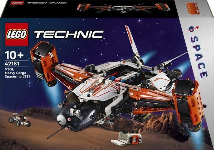 • Postavte futuristickou vesmírnou loď – Fanoušci vesmíru od 10 let si užijí stavění a průzkum modelu LEGO® Technic VTOL Vesmírná loď na přepravu těžkého nákladu LT81• Podvozek pro vertikální přistání a vzlétnutí – Děti mohou vysouvat a zasouvat přistávací podvozek a objevovat možnosti a výzvy života a práce na cizích planetách prostřednictvím nápaditého hraní• Přepravte náklad – Součástí je miniaturní vesmírné vozítko, které lze umístit do nákladního modulu a přesunout pod loď pomocí vysouvacího drapáku• Rukojeť a otáčecí motory – Malí průzkumníci vesmíru uchopí rukojeť, roztočí motory a užasnou nad samovyrovnávacím kokpitem při předvádění vzdušných manévrů• Hračka s vesmírnou tematikou – Zábavný dárek pro děti od 10 let, které se zajímají o vesmírné cestování a modely futuristických vesmírných lodí• Vzduchový zámek – Součástí stavebnice je speciální vesmírný vzduchový zámek, pomocí kterého mohou děti propojit tento model s dalšími vesmírnými stavebnicemi LEGO® (prodávají se samostatně) a vydat se na další vesmírná dobrodružství• Úvod do světa techniky – Stavebnice LEGO® Technic přináší realistické mechanismy a pohybové funkce, které stavitele LEGO uvedou a vtáhnou do světa techniky• Rozměry – Stavebnice se skládá z 1 365 dílků a model vesmírné lodě měří přes 19 cm na výšku, 52 cm na délku a 47 cm na šířku