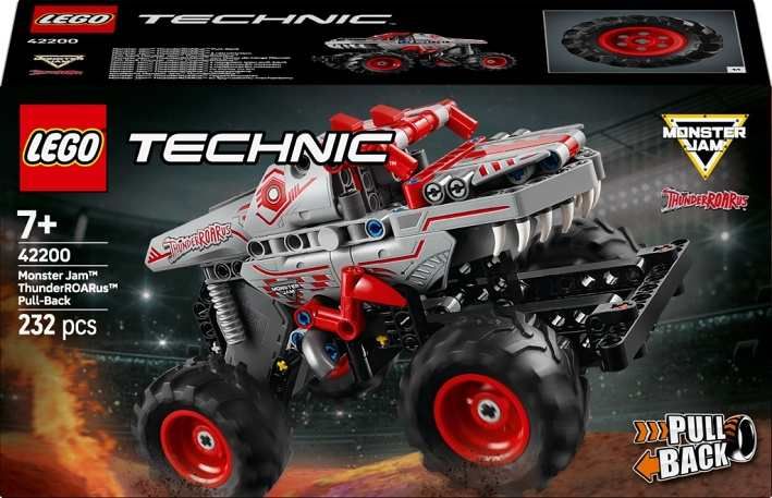 Natahovací truck pro děti od 7 let – LEGO® Technic Monster Jam™ ThunderROARus™ s natahovacím motorem pro holky a kluky, kteří milují monster trucky a hračky s dinosaury Model trucku s natahovacím motorem – Aktivujte truck zatažením a připomeňte si strhující chvilky v aréně Monster Jam™ s rychlými triky a kaskadérskými kousky Prvky inspirované dinosaury – Model trucku se pyšní autentickými designovými detaily, jako jsou šupiny, hroty, zuby a realistické pneumatiky inspirované skutečným vozem Monster Jam™ ThunderROARus™ Skvělý dárek pro děti, které milují stavění a hraní – Stavebnice představuje zábavný dárek pro děti a pomůže jim v rozvoji stavitelských dovedností Skvělý tip na dárek – Tento monster truck LEGO® představuje úchvatný dárek pro děti, které mají rády natahovací vozidla Úvod do světa techniky – Stavebnice LEGO® Technic nabízejí realistické mechanismy a funkce pohybu, které uvedou mladé stavitele do světa techniky Rozměry – Stavebnice se skládá z 232 dílků a model trucku měří přes 12 cm na výšku, 18 cm na délku a 11 cm na šířku.