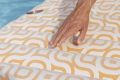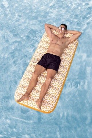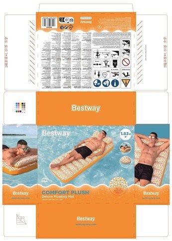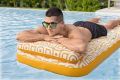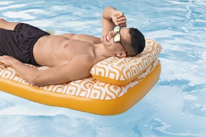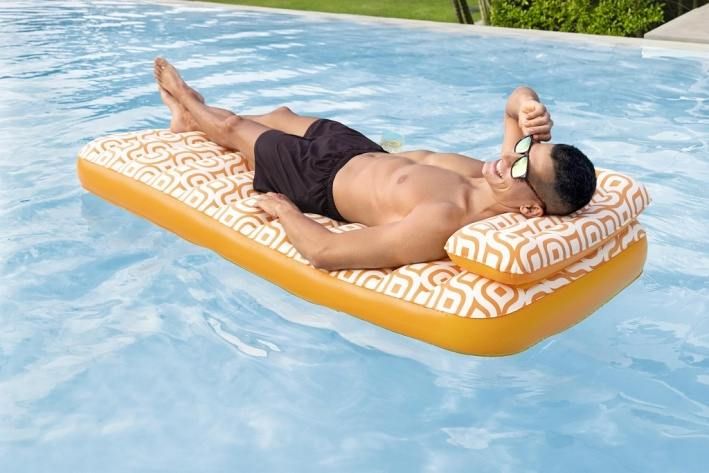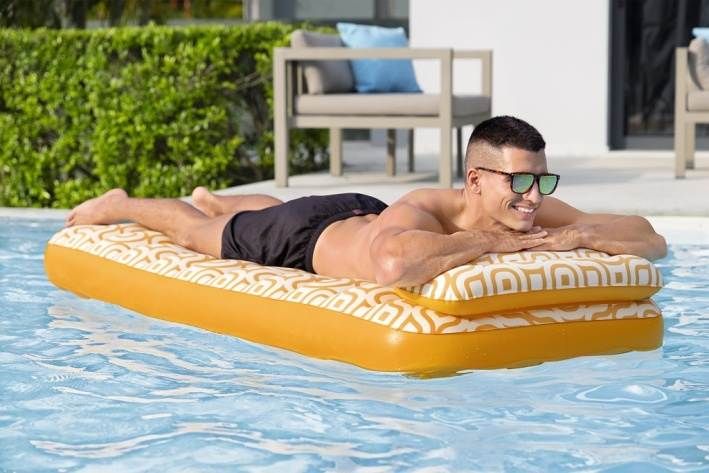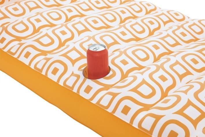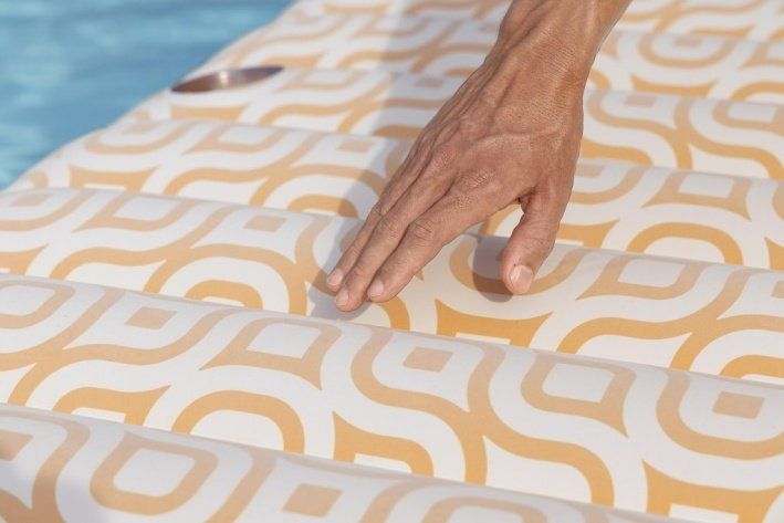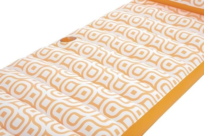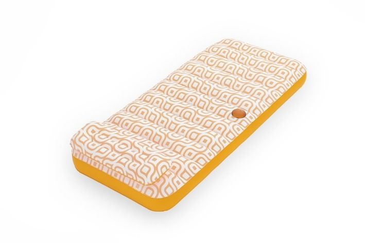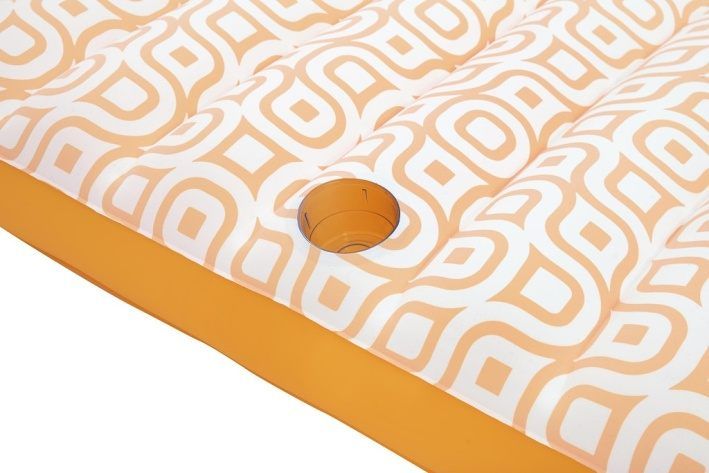 Lehátko nafukovací Comfort Plush je navrženo tak, aby poskytovalo maximální pohodlí při relaxaci ve vodě. Disponuje rozměry 183 × 84 cm, což nabízí dostatek prostoru pro pohodlné ležení dospělé osoby. Povrch lehátka je pokryt vodotěsným sametem s jemným geometrickým vzorem v odstínech bílé a teplé oranžové, který nejenže zajišťuje příjemný dotek, ale také esteticky ladí s letní atmosférou u bazénu. Celkový design lehátka působí moderně a elegantně, což podtrhuje i integrovaný polštář, na který se lze během odpočinku pohodlně opřít. Lehátko je konstruováno s dvěma samostatnými vzduchovými komorami, které zvyšují jeho stabilitu a bezpečnost na vodě. Jeho maximální nosnost činí 100 kg, což umožňuje použití většinou dospělých uživatelů. V blízkosti polštáře je zabudován praktický držák na nápoj, který usnadňuje udržení lahodného osvěžení během relaxace. Tento detail přispívá k pohodlnému a příjemnému zážitku z pobytu na vodě. Materiál lehátka je odolný vůči vodě a zároveň příjemný na dotek, což potvrzují i detaily z fotografií, kde je vidět sametová textura povrchu. Součástí balení je také opravná záplata, která umožňuje snadné a rychlé řešení případných drobných poškození. Lehátko je vhodné nejen do bazénu, ale i na klidné vodní plochy, kde může sloužit k odpočinku, opalování či posezení u vody. Celkově je nafukovací lehátko Comfort Plush praktickým a komfortním doplňkem pro letní dny strávené u vody. Kombinace kvalitního materiálu, funkčních prvků a příjemného designu zaručuje, že relaxace bude maximálně pohodlná a stylová. Díky své velikosti a nosnosti je vhodné pro širokou škálu uživatelů, kteří chtějí strávit čas u vody aktivně i odpočinkově.