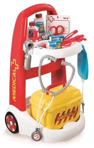 Vozík pro malé lékaře je vybaven přístroji pro zjištění zdravotního stavu pacienta. Obsahuje např. stříkačku, teploměr, stetoskop a další. Celkem 16 ks příslušenství. Rozměry: 31 x 55,5 x 31,2 cm. Hmotnost 1,70 kg.