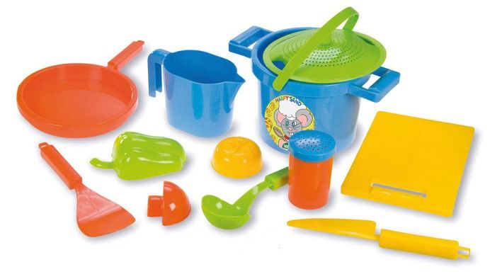 Set k vařeníse skládá ze sítko/poklička, hrnec, 3x zelenina, solnička, naběračka, obracečka, nůž, prkénko, pánev, odměrka