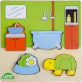 Dřevěné barevné puzzle koupelna, je vyrobeno pro nejmenší děti. Rozděleno do několika části s předem vytvořenými drážkami v podložce, která zlepšují usazení jednotlivých částí dílků.