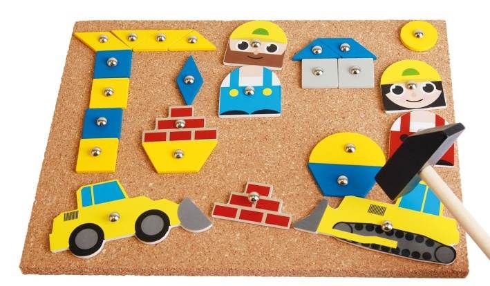 Obsahuje: 56 barevných dřevěných dílků, 8 potištěných speciálních tvarů, kladívko, hřebíky a korková deska: 27x20,5cm. Podporuje kreativitu a motoriku