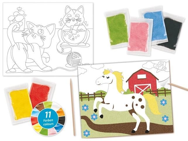 2 motivy - koně a kočky. Písek v 11 barvách, který se sype na lepící podklad, pro vytvoření barevného obrázku.