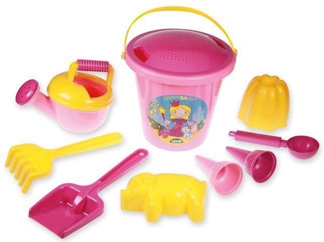 Sada obsahuje kyblík, lopatku, hrábě, 2 formicky, sítko, konvička, naběračka na zmrzlinu, 2x kornoutky na zmrzlinu.
