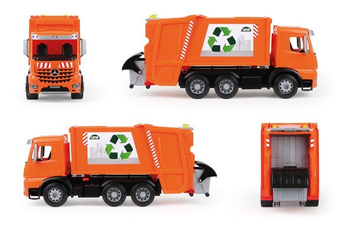Mercedes Arocs popelář. 6mm tlusté kovové osky u kol. Součástí je pojistka proti nežádoucímu vyklopení. 1x malá + 1x velké popelnice. BALENO SAMOSTATNĚ V HNĚDÉM KARTÓNU.