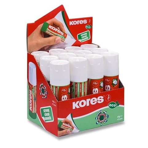 Lepicí tyčinka Kores EKO je 95% lepicí hmota z přírodních materiálů, 85% z recyklovaného materiálu. Obsahuje glycerin pro jemné lepení.Lepí na všechny druhy papíru, trvale zasychá.