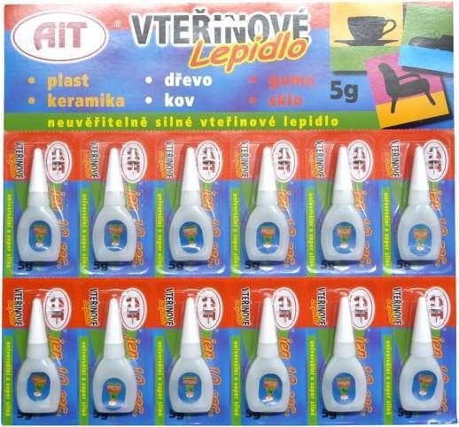 - spolehlivé kyanoakrylátové lepidlo - vhodné na plast, porcelán, kov, dřevo, karton, kůži a gumu - nevhodné pro lepení PE, PP, polystyrenu a jemné kůže - obsah 5g