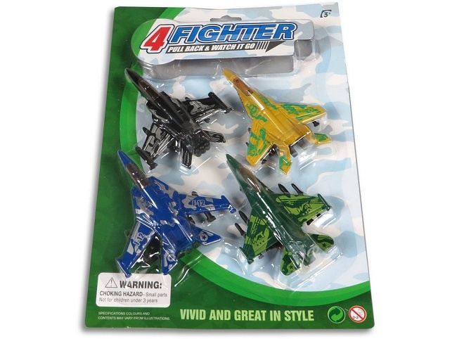 Letadla na zpětný chod, 7 cm. Malá letadla pro malé letce. Balení obsahuje 4 ks různobarevných stíhaček. Pozvi kamarády a vrhněte se na leteckou akrobacii.