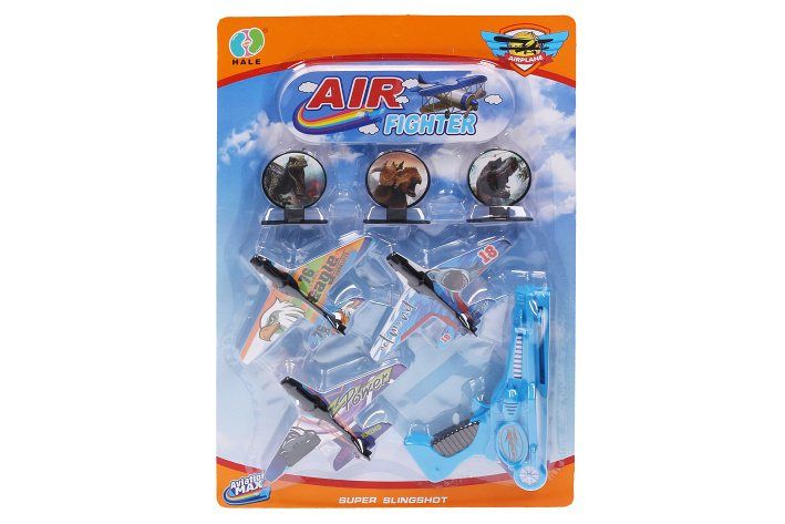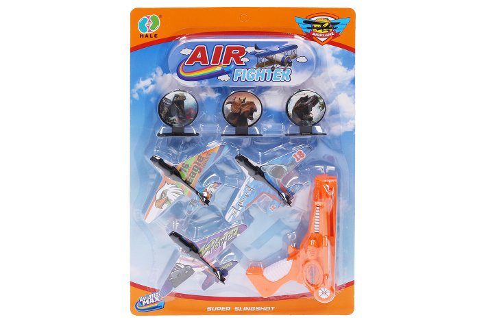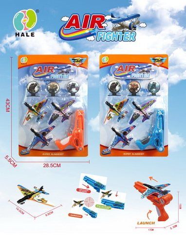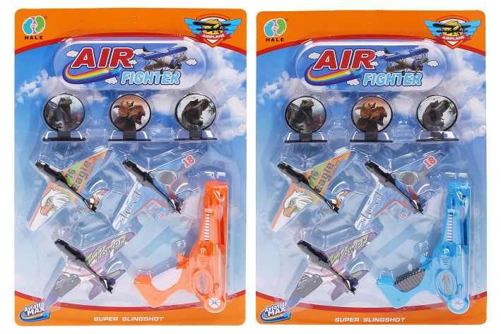 Letadla vystřelovací 3 ks. Rozměry letadla 14,5x9,5 cm, pistole 17x5,5x15 cm. 2 varianty pistole - modrá, oranžová.