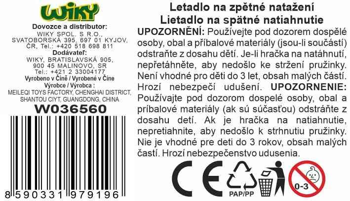Letadlo kovové. Rozměry 14x13x4 cm. Na zpětné natažení. 6 ks display box. 2 varianty - modrá, červená.