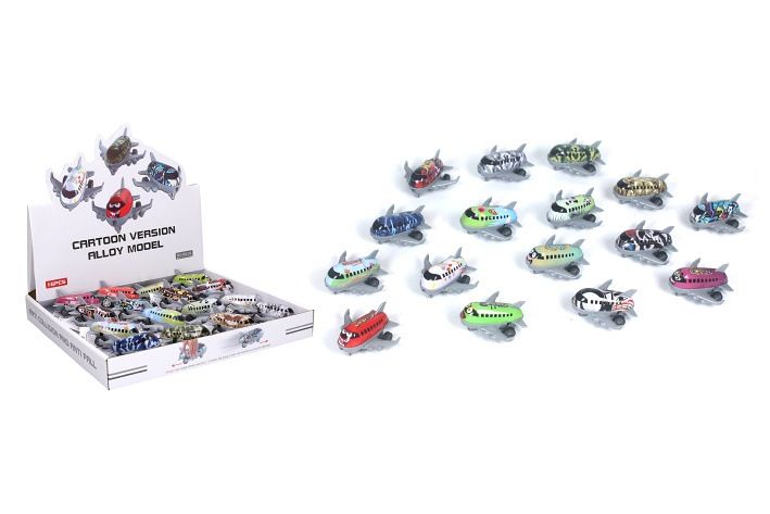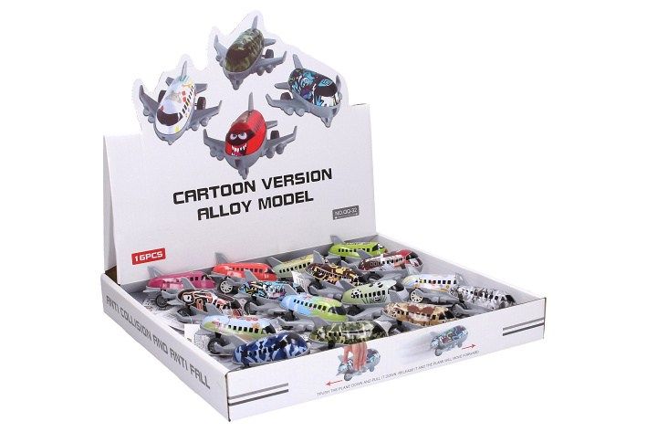 Letadlo kov/plast. Velikost 7,5 cm. Na zpětné natažení. 16 ks display box. 16 barevných variant.