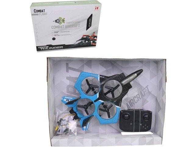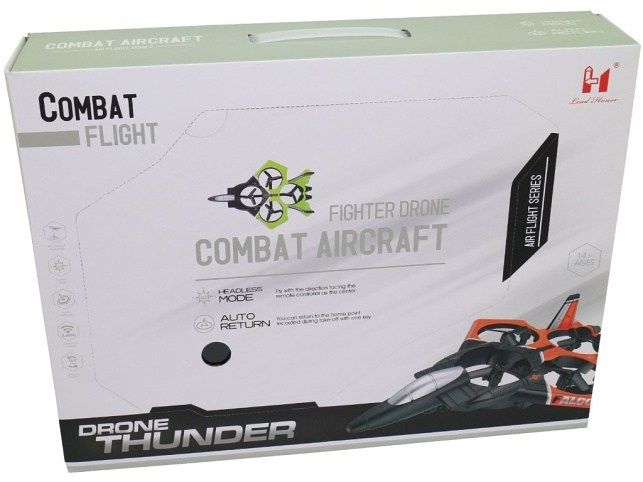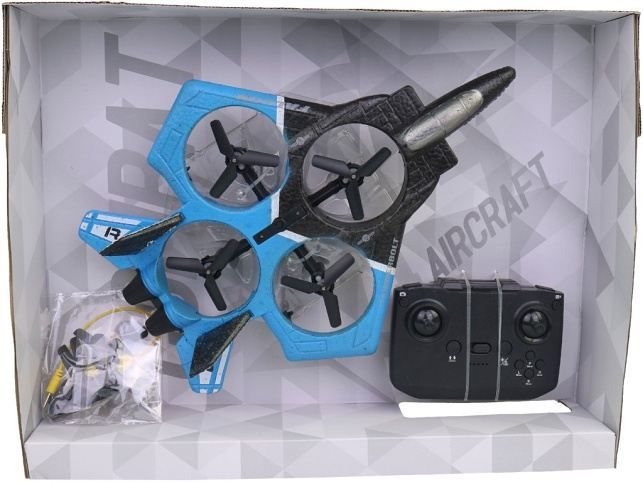 Letadlo na ovládání, soft, 30 x 7 x 22 cm. Stíhací letadlo na ovládání, 2,4 GHz, 24 cm. Stíhačka má mnoho funkcí jako je automatické přistání a vzlet, 6-osý gyroskop, umí udělat otočku o 360stupňů, má vyhybání překážkám, zvolení rychlosti, je bez kamery. Materiál: plast. Rozměr balení: 40 x 9 x 30 cm. Rozměr produktu: 30 x 7 x 22 cm. Napájení ovladače: 3 x AAA baterie nejsou součástí balení. Balení obsahuje: stíhačku, ovladač, náhradní vrtulky, šroubovák. Doporučený věk od 14 let.