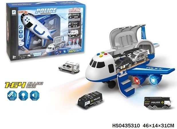 Letadlo Policie sada s příslušenstvím (sada) Rozměr garáže po rozložení: 25 × 28 × 30 cm, tlačítka pro zvukové a světelné efekty, jízda na setrvačník Obsah sady: hasičské letadlo/garáž 2v1 (funkce přeměny z letadla na garáž a zpět) a kovový model autíčka 1:64 (3 ks) Na baterie: 3x AA (nejsou součástí balení)