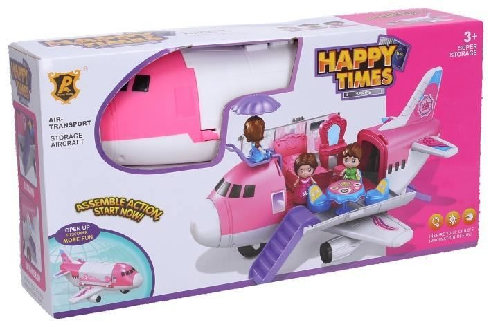 Letadlo s figurkami. Rozměry složeného letadla 34x28. 5x17,5 cm. Obsahuje díly a nálepky k sestavení letadla, figurky, nábytek do letadla, obrázkový návod k sestavení na obale. Bok letadla je otevírací.
