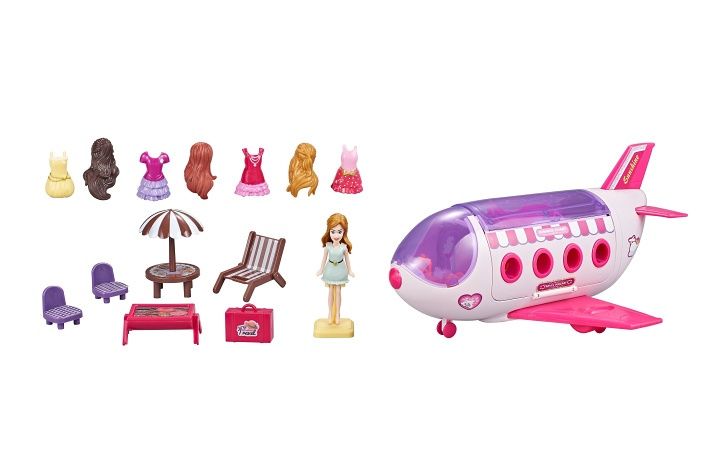 Letadlo s panenkou a příslušenstvím. Velikost letadla 28 cm. Balení obsahuje letadlo, panenku, zahradní nábytek s grilem, šaty a vlasy pro panenku.