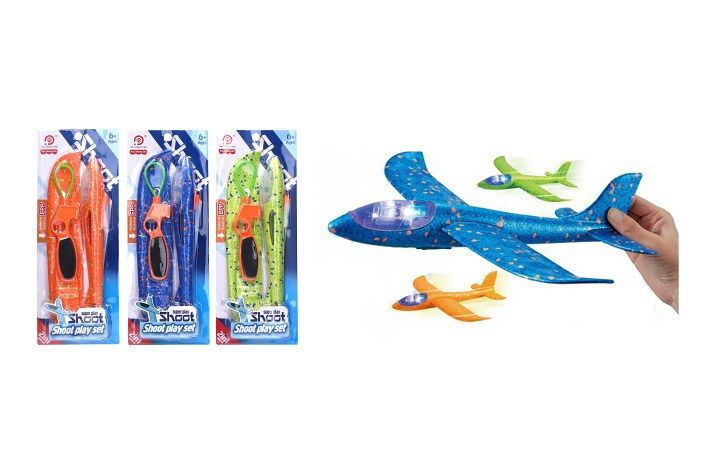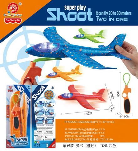 Letadlo vystřelovací s efekty. Rozměry 34x9x33 cm. Světelné efekty. 3xAG3 baterie jsou součástí balení. 3 varianty - modrá, zelená, oranžová.