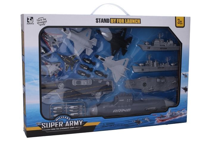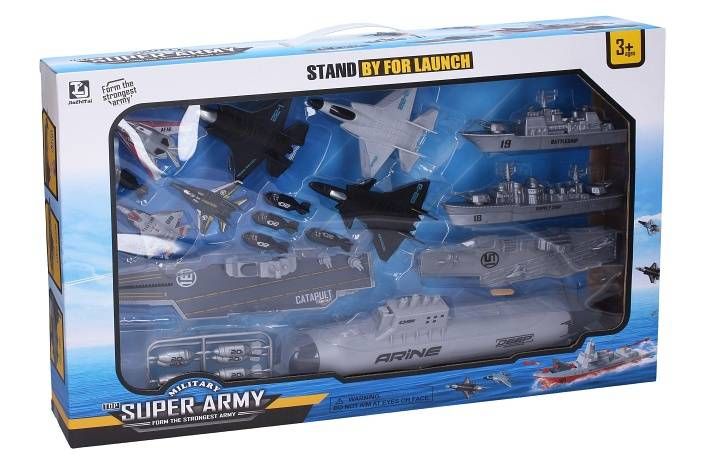 Letadlová loď s katapultem 25 cm set s ponorkou. Obsah balení - letadlová loď na setrvačník s katapultem na stíhačky 25 cm, ponorka s vystřelováním torpéd 28 cm na setrvačník, letadlová loď 18 cm, bitevní loď 16 cm, bitevní křižník 14 cm, 3x stíhačka volná kola 12 cm, 3x stíhačka katapultovací 7 cm, 12x torpédo do ponorky. Katapult - vložte stíhačku do pružiny v přední části letadlové lodě, vystřelení tlačítkem na věži. Torpédo - odklopte dvířka v horní části ponorky - vložte torpédo (max 3), sejměte přední krytku ponorky, natažením a puštěním ocasního kormidla ponorky vystřelíte torpédo. Obrázkový návod na obalu.