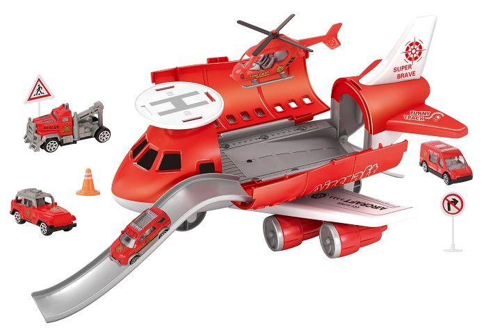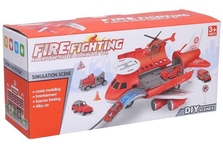 Letadlová stanice hasičská. Rozměry 30x29x14 cm. Součástí 4 auta, 1 vrtulník. Volná kola. Obsahuje letadlovou stanici, 4 malé dopravní prostředky, dráhu, heliport, značky, kužely. Obrázek na sestavení na boční straně obalu.