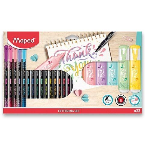 Jedinečná soupravaLettering set Maped pro všechny nadšence kaligrafie. Zvýrazňovače jsou ideální pro psaní písmen různé tloušťky a jemné špičky linerů k dokreslení jejich obrysu.