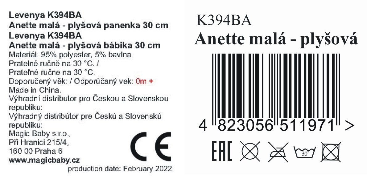 Levenya je značka plyšových panenek, zvířátek a různých roztomilých postaviček s nezaměnitelným designem a dokonalým opracováním. Annete je roztomilá, na dotek velmi příjemná měkká panenka, která je tou nejlepší společnicí každé malé holčičky, která se ráda se svou panenkou mazlí a i usíná. Panenka je vyrobena z vysoce kvalitního hladkého lesklého plyše a je pratelná (ručně na 30 °C). Díky své velikosti a lehoučké váze je ideální panenkou pro malé holčičky. Velikost 36 cm. Nevhodné pro děti do 3 let. Panenka je balena v igelitovém sáčku, který slouží pouze jako ochrana před ušpiněním při přepravě. Vyrobeno v Číně.