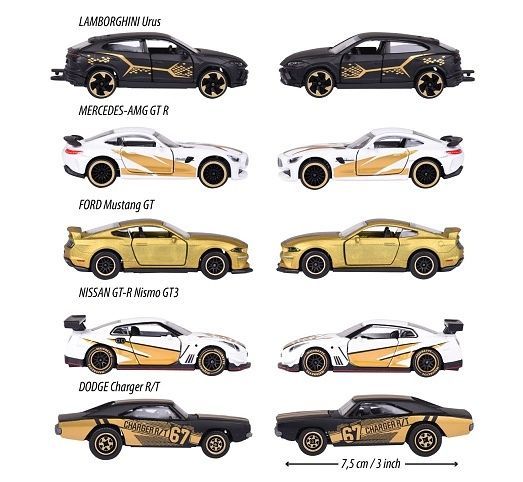 Dárková sada kovových modelů aut na volnoběh, otevírací části, délka autíčka 7,5 cm. Obsahuje Lamborghini Urus, Mercedes AMG GT R, Ford Mustang GT, Nissan GT-R Nismo GT3 a Dodge Charger R/T.