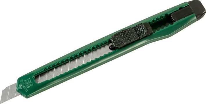 Materiál: plast, ocelová odlamovací čepel, délka čepele 8 cm, šířka ostří 9 mm, tloušťka ostří 0,3 mm. Vhodné k řezání papíru, kartonu atd. Zelený