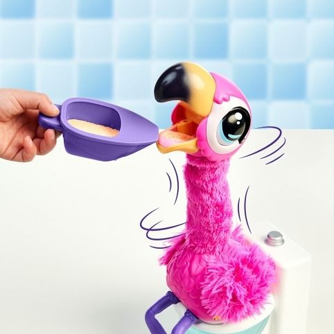 Nejvtipnější Plameňák, jaký jste kdy krmili! Až sní speciální potravu a začne zpívat, musí hned běžet na záchod, takže toaletu držte v pohotovosti! Nakrmte Flaminga speciálním krmivem a uvidíte, co se bude dít! Po nasypání krmiva speciální lopatkou do zobáku Flaminga ho musí posunout dolů po trupu, takže se mu začne vlnit krk. Když začne zpívat píseň, je to znamení, že musí být vysazen na toaletu naplněnou vodou. Co se dostalo dovnitř, musí se dostat ven! Plameňák dělá neonovou hovínko a přitom vydává vtipné zvuky. Opakuje to, co se mu říká. Po přelití obsahu toalety do lopatky můžeme začít krmení znovu.Specifikace produktu: 1 Plameňák, 1 Toaleta, 1 Potrava, 1 lopatka, Návod, Napájení –3 x AA 1.5 V (testovací součásti jsou součástí balení). Hračka funguje nejlépe s novými alkalickými bateriemi. Součástí balení jsou 3 baterie pro demonstrační účely – AA/LR06. Na baterie: 3x AA (jsou součástí balení)
