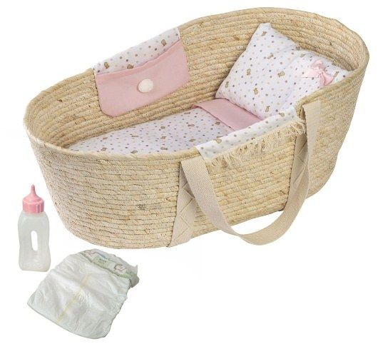Mojžíšův košík Llorens pro panenky a miminka s povlečením, udělá radost každé malé mamince, která chce mít svou panenku či miminko vždy po ruce. Na obou stranách košíku jsou látkové kapsičky. Ozdobná peřinka s polštářem a matrací je nejenom krásným doplňkem tohoto přenosného košíku, ale také nepostradatelnou výbavou každé holčičky, která si hraje s panenkami. Hrajte si, procházejte se, houpejte a uspávejte, prostě si užívejte svou hru naplno. Košík je určený pro panenky velikosti 40-45 cm, ale velmi dobře může posloužit i jako místo pro uložení plyšáků či jiných hraček a zdobit tak dětský pokojík. Součástí košíku je také lahvička na hraní pro panenky plnitelná vodou a jednorázová plenka. Košík je ručně tkaný ze sušených kukuřičných listů. Jedná se tedy o ekologický výrobek, vyrobený ze 100% přírodních materiálů. Při zašpinění otřete vlhkým hadříkem a ihned osušte. Rozměry košíku: 51 x 31 x 20,4 cm (d x š x v). Vyrobeno ve Španělsku - Onil. Baleno v igelitovém obalu. Doporučený věk od 3 let.