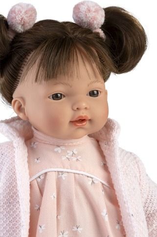 Mluvící a plačící panenka (po vyjmutí pojistky ihned funkční) s měkkým látkovým tělem a s vlásky po celé hlavě. Hlava a končetiny jsou vyrobené z kvalitního měkčeného vinylu. Po vytažení dudlíku z úst začne panenka říkat „mama“, „papa“ a vydávat reálný zvuk plačícího dítěte, který lze utišit opět magnetickým dudlíkem. Velikost panenky 33 cm. Ručně vyrobeno ve Španělsku, baleno v dárkové krabici. Doporučený věk od 3 let. K panence je možné dokoupit další originální oblečení z nabídky Llorens pro panenky velikosti 33 cm. Součástí balení je 3 x knoflíková baterie LR44 s návodem na její výměnu. Baterie jsou spotřební zboží a proto jejich vybití není důvodem k reklamaci panenky.