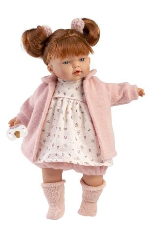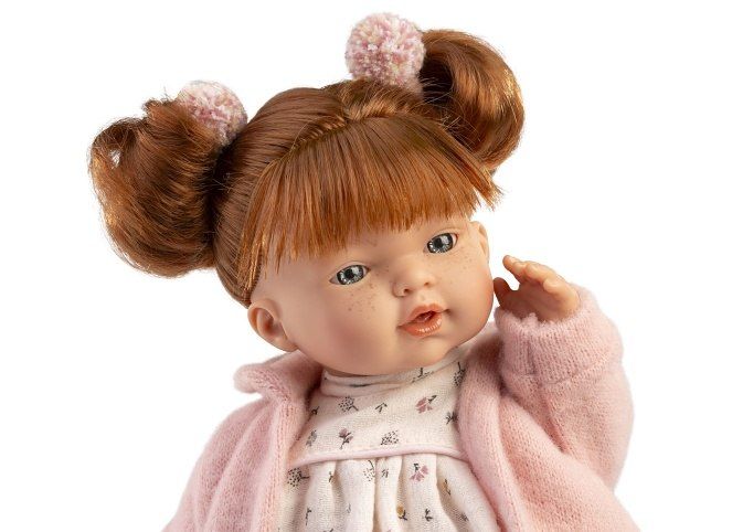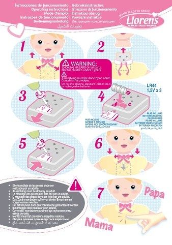 Mluvící a plačící panenka (po vyjmutí pojistky ihned funkční) s měkkým látkovým tělem a s vlásky po celé hlavě. Hlava a končetiny jsou vyrobené z kvalitního měkčeného vinylu. Po vytažení dudlíku z úst začne panenka říkat „mama“, „papa“ a vydávat reálný zvuk plačícího dítěte, který lze utišit opět magnetickým dudlíkem. Velikost panenky 33 cm. Ručně vyrobeno ve Španělsku, baleno v dárkové krabici. Doporučený věk od 3 let. K panence je možné dokoupit další originální oblečení z nabídky Llorens pro panenky velikosti 33 cm. Součástí balení je 3 x knoflíková baterie LR44 s návodem na její výměnu. Baterie jsou spotřební zboží a proto jejich vybití není důvodem k reklamaci panenky.