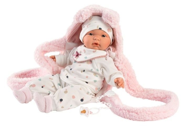 Mluvící a plačící panenka (po vyjmutí pojistky ihned funkční) s měkkým látkovým tělem. Hlava a končetiny jsou vyrobené z kvalitního měkčeného vinylu. Po vytažení dudlíku z úst začne panenka říkat „mama“, „papa“ a vydávat reálný zvuk plačícího dítěte, který lze utišit opět magnetickým dudlíkem. Velikost panenky 38 cm. Ručně vyrobeno ve Španělsku, baleno v dárkové krabici. Doporučený věk od 3 let. K panence je možné dokoupit další originální oblečení z nabídky Llorens pro panenky velikosti 38 cm. Součástí balení je 3 x knoflíková baterie LR44 s návodem na její výměnu. Baterie jsou spotřební zboží a proto jejich vybití není důvodem k reklamaci panenky.