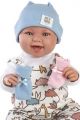 Mluvící miminko s měkkým látkovým tělem, které se po zatlačení na hrudník začne smát a říkat „mama“, „papa“. Ruce a nohy jsou k tělu přichyceny kloubem. Miminko je polohovací a může i sedět. Přiložené doplňkové oblečení (čepička a ponožky) umožnují mít z miminka při hraní jak variantu holčičky, tak chlapečka. Dudlík v balení slouží pouze jako doplněk. Velikost 44 cm. Ručně vyrobeno ve Španělsku, baleno v dárkové krabici. Doporučený věk od 3 let. K miminku je možné dokoupit další originální oblečení z nabídky Llorens pro miminka NEW BORN velikosti 43-45 cm. Součástí balení je 3 x knoflíková baterie LR44 s návodem na její výměnu. Baterie jsou spotřební zboží a proto jejich vybití není důvodem k reklamaci panenky.