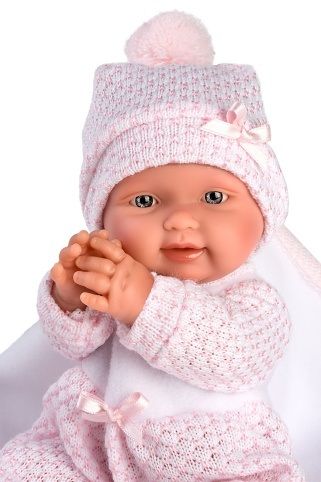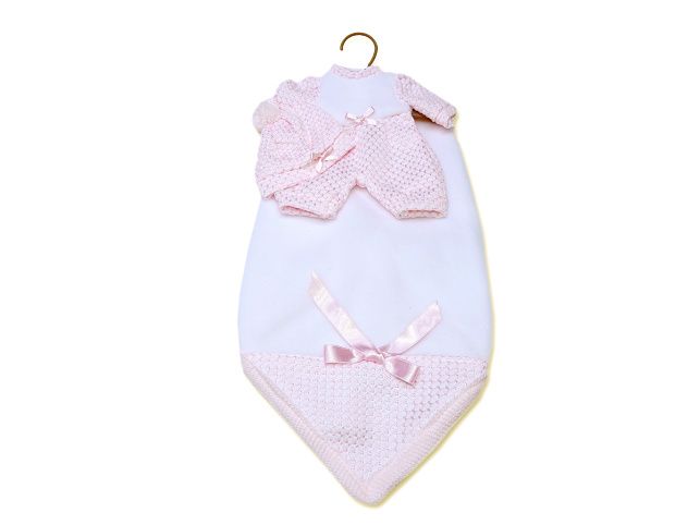 2dílný obleček s ozdobnou dečkou a mašličkou pro panenku miminko NEW BORN Llorens velikosti 26 cm. Vyrobeno ve Španělsku, baleno v igelitovém obalu s plastovým nebo kartonovým ramínkem. Doporučený věk od 3 let.