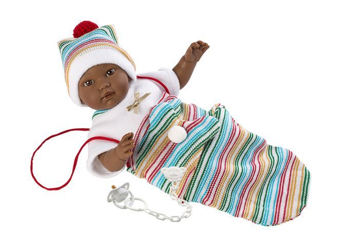 3dílný obleček včetně přenosného vaku na suchý zip pro panenku miminko Llorens velikosti 30 cm. Vyrobeno ručně ve Španělsku, baleno v igelitovém obalu s plastovým ramínkem. Doporučený věk od 3 let.