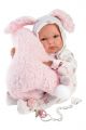 2dílný obleček s motivem zajíčka s měkkoučkou funkční podložkou s tříbodovým pásovým uchycením pro panenku miminko NEW BORN Llorens velikosti 35-36 cm. Vyrobeno ručně ve Španělsku, baleno v igelitovém obalu s plastovým ramínkem. Doporučený věk od 3 let.